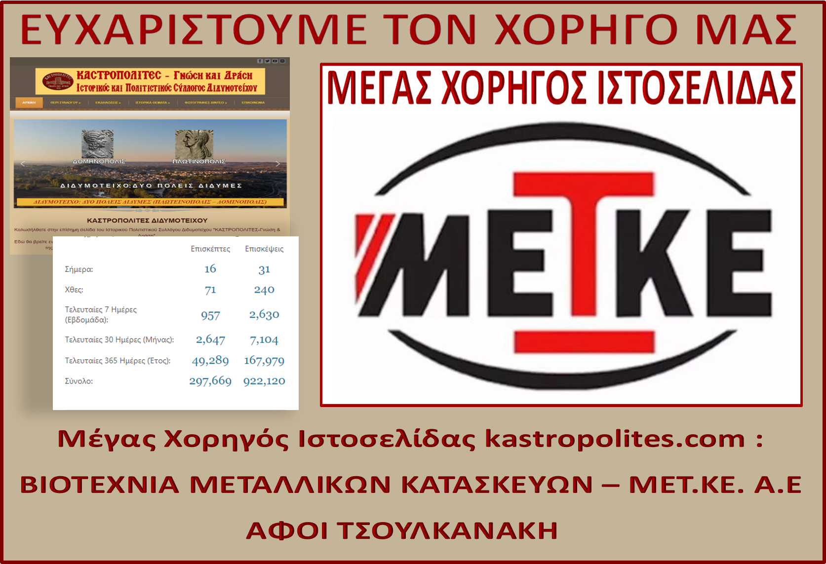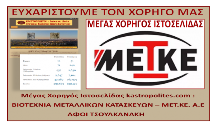 Με χαρά και ευγνωμοσύνη ευχαριστούμε πολύ τον Μεγάλο Χορηγό της Ιστοσελίδας μας kastropolites.com : ΒΙΟΤΕΧΝΙΑ ΜΕΤΑΛΛΙΚΩΝ ΚΑΤΑΣΚΕΥΩΝ – ΜΕΤ.ΚΕ. Α.Ε ΑΦΟΙ ΤΣΟΥΛΚΑΝΑΚΗ metke.gr.