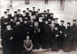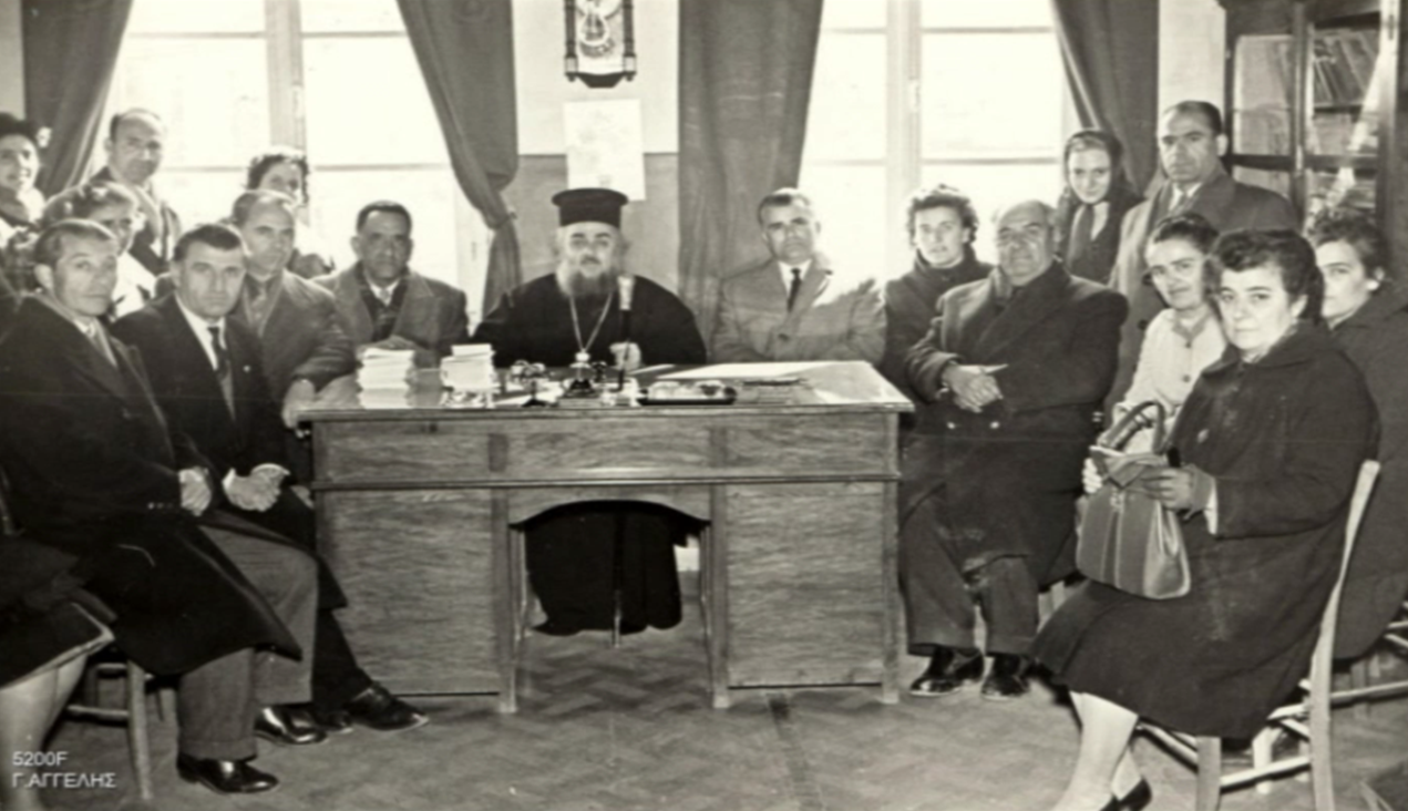 Παύλος Καββαδίας και αριστερά του ο πρωτοσύγγελος Στέφανος Παπαδόπουλος. Επάνω αριστερά τελευταίος ο παπα Χρήστος Χριστακούδης. Πίσω από τον Μητροπολίτη, με τη γραβάτα ο Αθανάσιος Θεοδωρίδης, γραμματέας της Μητροπόλεως.