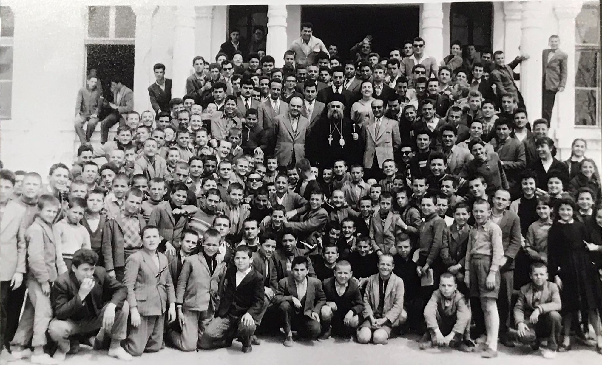 Ο μητροπολίτης Κωνστντίνος στην αυλή του 1ου ΔΣ με δασκάλους και μαθητές, αρχείο Γ. Αγγέλη.