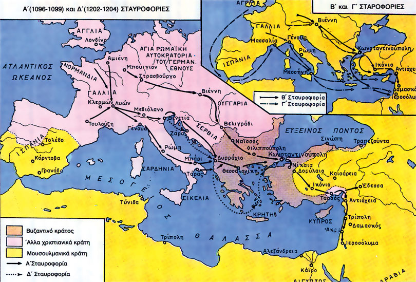 Τον 12ο αιώνα, το Δυτικό Ρωμαϊκό κράτος στην προσπάθειά του να ελέγξει τη περιοχή της Μέσης Ανατολής, ανακάλυψε ως πρόσχημα την προστασία των Αγίων Τόπων από τους μουσουλμάνους. Έτσι ξεκίνησε μια σειρά από εκστρατείες με το όνομα Σταυροφορίες. Τα γεγονότα όμως έδειξαν ότι πίσω από τα θρησκευτικά κίνητρα κρύβονταν η επιθυμία κυρίως της διάλυσης της Βυζαντινής Αυτοκρατορίας και της άλωσης της Κωνσταντινούπολης.